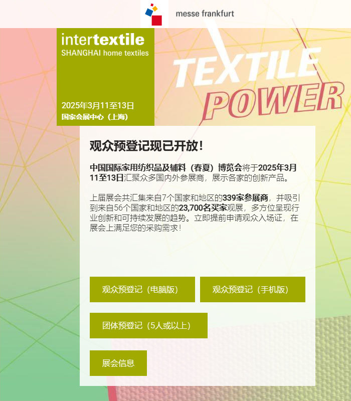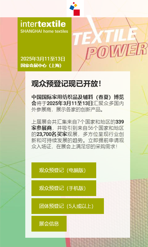 我们在此提醒所有参加展会的参展商和买家们,欲希望在中国国际家用纺织品及辅料博览会(Intertextile Shanghai Home Textiles)上刊登广告,请通过我们主办方的正式渠道进行咨询。部分声称可提供广告服务的公司有机会涉及诈骗行为,因此在与任何企业合作之前,请务必核实该公司信息。如果您对此有任何疑问,请随时与我们联系。